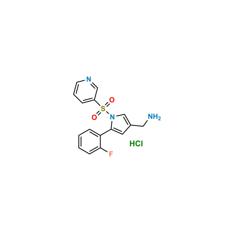 N-Desmethyl Vonoprazan is chemically (5-(2-Fluorophenyl)-1-(pyridin-3-ylsulfonyl)-1H-pyrrol-3-yl)methanamine hydrochloride. N-Desmethyl Vonoprazan is supplied with detailed characterization data compliant with regulatory guideline. N-Desmethyl Vonoprazan can be used for the analytical method development, method validation (AMV), Quality Controlled (QC) application for Abbreviated New Drug Application (ANDA) or during commercial production of Vonoprazan.