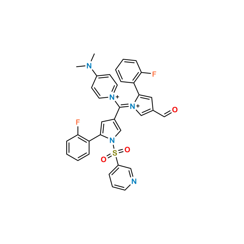Vonoprazan Dimer Impurity 1 is chemically (Z)-4-(Dimethylamino)-1-((5-(2-fluorophenyl)-1-(pyridin-3-ylsulfonyl)-1H-pyrrol-3-yl)(2-(2-fluorophenyl)-4-formyl-1H-pyrrol-1-ium-1-ylidene)methyl)pyridin-1-ium. Vonoprazan Dimer Impurity 1 is supplied with detailed characterization data compliant with regulatory guideline. Vonoprazan Dimer Impurity 1 can be used for the analytical method development, method validation (AMV), Quality Controlled (QC) application for Abbreviated New Drug Application (ANDA) or during commercial production of Vonoprazan.
