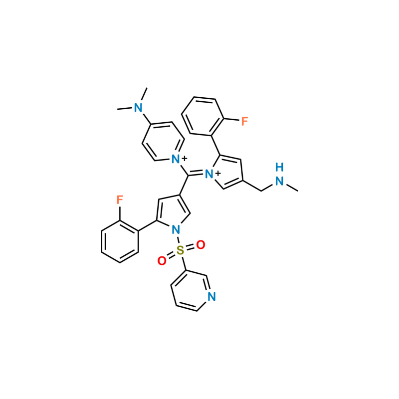Vonoprazan Dimer Impurity 2 is chemically (Z)-4-(Dimethylamino)-1-((5-(2-fluorophenyl)-1-(pyridin-3-ylsulfonyl)-1H-pyrrol-3-yl)(2-(2-fluorophenyl)-4-((methylamino)methyl)-1H-pyrrol-1-ium-1-ylidene)methyl)pyridin-1-ium. Vonoprazan Dimer Impurity 2 is supplied with detailed characterization data compliant with regulatory guideline. Vonoprazan Dimer Impurity 2 can be used for the analytical method development, method validation (AMV), Quality Controlled (QC) application for Abbreviated New Drug Application (ANDA) or during commercial production of Vonoprazan.