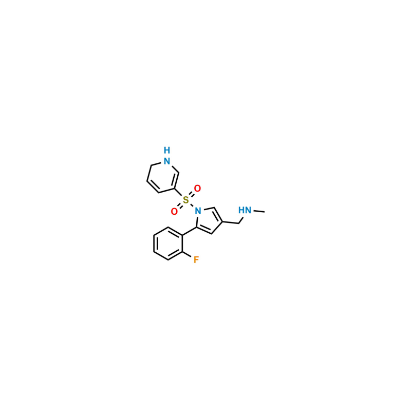 Vonoprazan Impurity 1 is chemically 1-(1-((1,6-Dihydropyridin-3-yl)sulfonyl)-5-(2-fluorophenyl)-1H-pyrrol-3-yl)-N-methylmethanamine. Vonoprazan Impurity 1 is supplied with detailed characterization data compliant with regulatory guideline. Vonoprazan Impurity 1 can be used for the analytical method development, method validation (AMV), Quality Controlled (QC) application for Abbreviated New Drug Application (ANDA) or during commercial production of Vonoprazan.