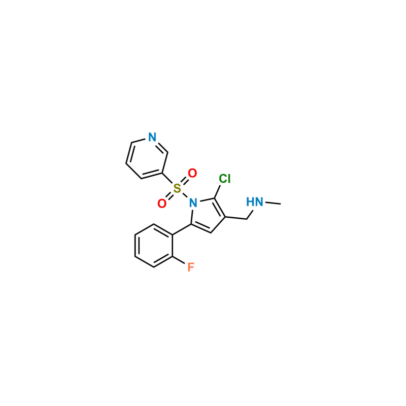 2-Chloro Vonoprazan is chemically 1-(2-Chloro-5-(2-fluorophenyl)-1-(pyridin-3-ylsulfonyl)-1H-pyrrol-3-yl)-N-methylmethanamine. 2-Chloro Vonoprazan is supplied with detailed characterization data compliant with regulatory guideline. 2-Chloro Vonoprazan can be used for the analytical method development, method validation (AMV), Quality Controlled (QC) application for Abbreviated New Drug Application (ANDA) or during commercial production of Vonoprazan.