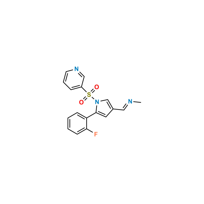 Vonoprazan Impurity 18 is chemically (E)-1-(5-(2-Fluorophenyl)-1-(pyridin-3-ylsulfonyl)-1H-pyrrol-3-yl)-N-methylmethanimine. Vonoprazan Impurity 18 is supplied with detailed characterization data compliant with regulatory guideline. Vonoprazan Impurity 18 can be used for the analytical method development, method validation (AMV), Quality Controlled (QC) application for Abbreviated New Drug Application (ANDA) or during commercial production of Vonoprazan.