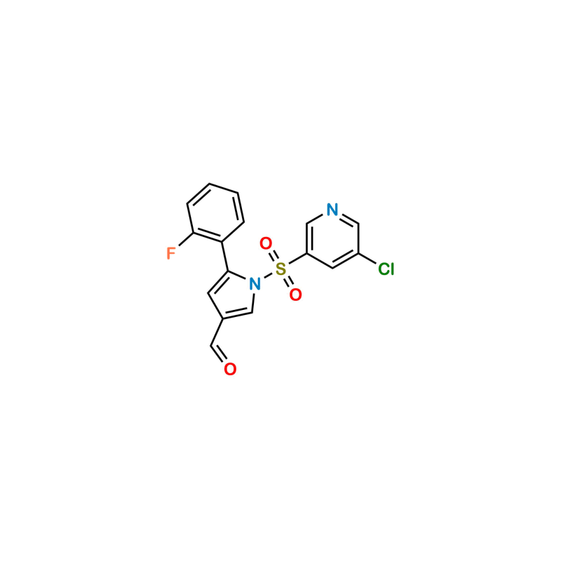 Vonoprazan Impurity 56 is chemically 1-((5-Chloropyridin-3-yl)sulfonyl)-5-(2-fluorophenyl)-1H-pyrrole-3-carbaldehyde. Vonoprazan Impurity 56 is supplied with detailed characterization data compliant with regulatory guideline. Vonoprazan Impurity 56 can be used for the analytical method development, method validation (AMV), Quality Controlled (QC) application for Abbreviated New Drug Application (ANDA) or during commercial production of Vonoprazan.