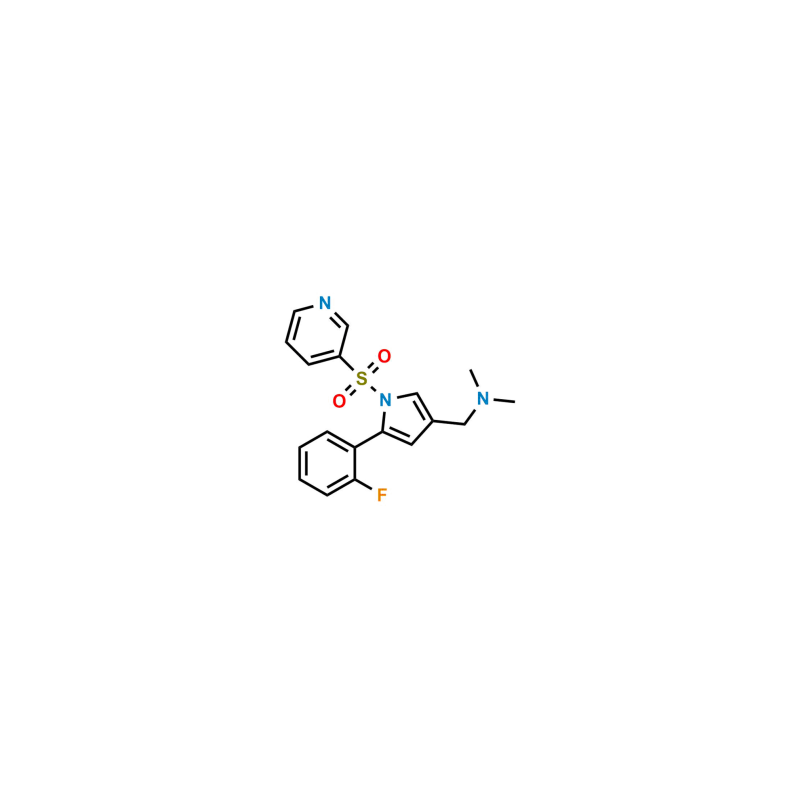 Vonoprazan Dimethylamine Impurity is chemically 1-(5-(2-Fluorophenyl)-1-(pyridin-3-ylsulfonyl)-1H-pyrrol-3-yl)-N,N-dimethylmethanamine. Vonoprazan Dimethylamine Impurity is supplied with detailed characterization data compliant with regulatory guideline. Vonoprazan Dimethylamine Impurity can be used for the analytical method development, method validation (AMV), Quality Controlled (QC) application for Abbreviated New Drug Application (ANDA) or during commercial production of Vonoprazan.