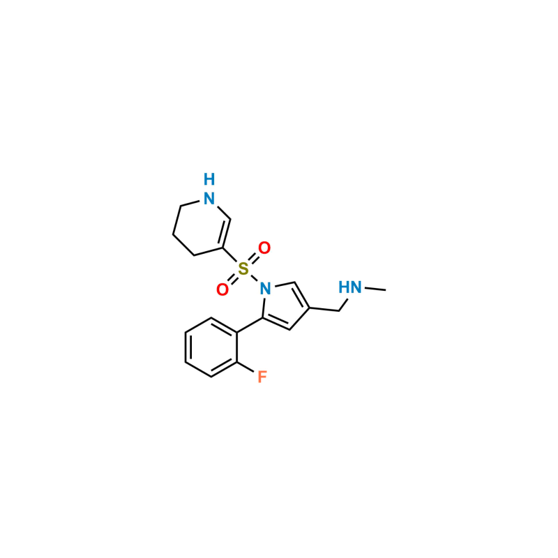 Vonoprazan Impurity 9 is chemically 1-(5-(2-Fluorophenyl)-1-((1,4,5,6-tetrahydropyridin-3-yl)sulfonyl)-1H-pyrrol-3-yl)-N-methylmethanamine. Vonoprazan Impurity 9 is supplied with detailed characterization data compliant with regulatory guideline. Vonoprazan Impurity 9 can be used for the analytical method development, method validation (AMV), Quality Controlled (QC) application for Abbreviated New Drug Application (ANDA) or during commercial production of Vonoprazan.