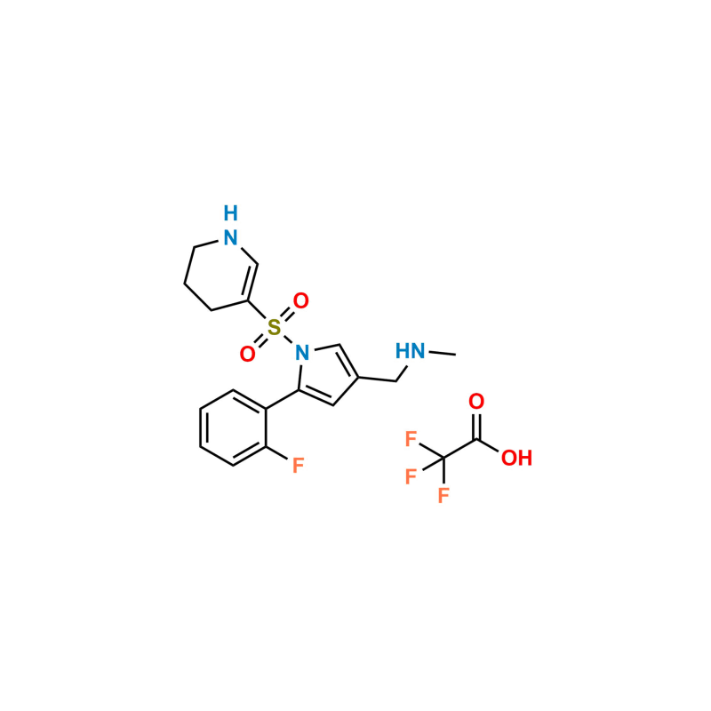 Vonoprazan Impurity 9 (TFA salt) is chemically 1-(5-(2-Fluorophenyl)-1-((1,4,5,6-tetrahydropyridin-3-yl)sulfonyl)-1H-pyrrol-3-yl)-N-methylmethanamine 2,2,2-trifluoroacetate. Vonoprazan Impurity 9 (TFA salt) is supplied with detailed characterization data compliant with regulatory guideline. Vonoprazan Impurity 9 (TFA salt) can be used for the analytical method development, method validation (AMV), Quality Controlled (QC) application for Abbreviated New Drug Application (ANDA) or during commercial production of Vonoprazan.