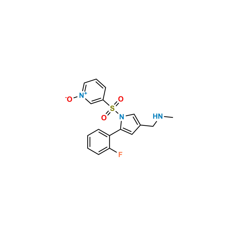 Vonoprazan N-Oxide is chemically 3-((2-(2-Fluorophenyl)-4-((methylamino)methyl)-1H-pyrrol-1-yl)sulfonyl)pyridine 1-oxide. Vonoprazan N-Oxide is supplied with detailed characterization data compliant with regulatory guideline. Vonoprazan N-Oxide can be used for the analytical method development, method validation (AMV), Quality Controlled (QC) application for Abbreviated New Drug Application (ANDA) or during commercial production of Vonoprazan.