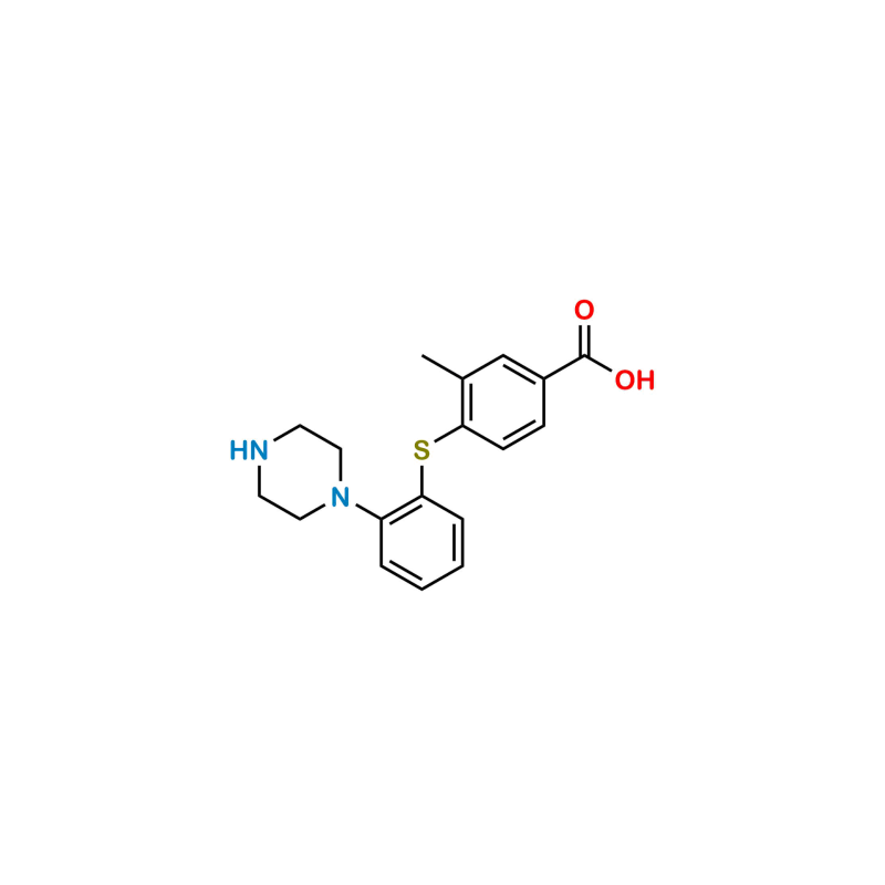 Vortioxetine Impurity 64 is chemically 3-Methyl-4-((2-(piperazin-1-yl)phenyl)thio)benzoic acid. Vortioxetine Impurity 64 is supplied with detailed characterization data compliant with regulatory guideline. Vortioxetine Impurity 64 can be used for the analytical method development, method validation (AMV), Quality Controlled (QC) application for Abbreviated New Drug Application (ANDA) or during commercial production of Vortioxetine.