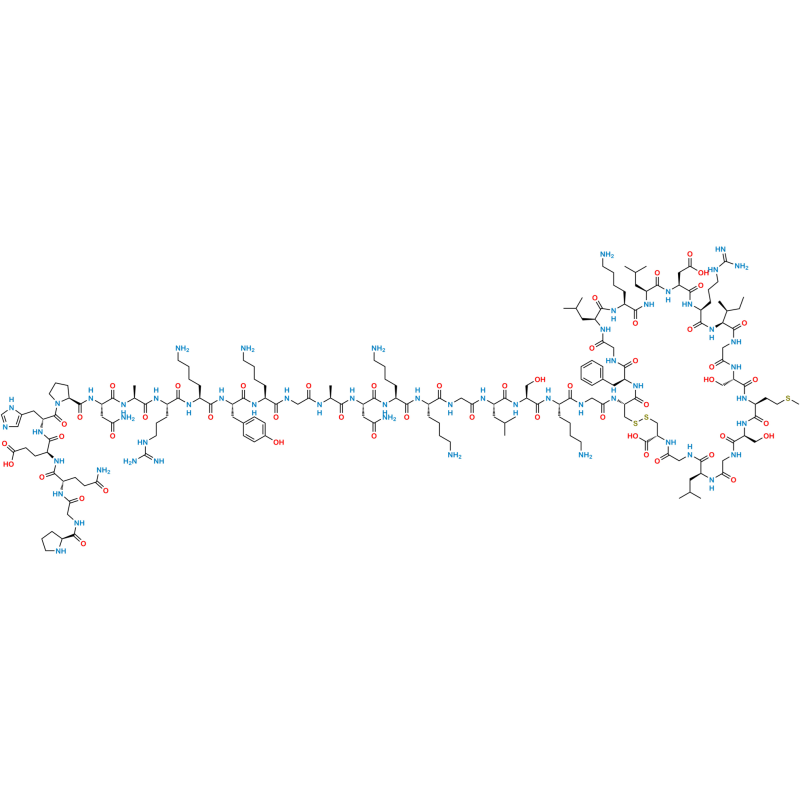 Chemical Name: (4R,10S,16S,19S,22S,28S,31S,34S,37S,40S,43S,49S,52R)-52-(2-((S)-2-((S)-2-((S)-2-(2-((S)-2-((S)-2-((S)-2-((S)-2-(2-((S)-2-((S)-2-((S)-2-((S)-2-((S)-2-((S)-2-((S)-1-(L-prolylglycyl-L-glutaminyl-L-glutamyl-D-histidyl)pyrrolidine-2-carboxamido)-4-amino-4-oxobutanamido)propanamido)-5-guanidinopentanamido)-6-aminohexanamido)-3-(4-hydroxyphenyl)propanamido)-6-aminohexanamido)acetamido)propanamido)-4-amino-4-oxobutanamido)-6-aminohexanamido)-6-aminohexanamido)acetamido)-4-methylpentanamido)-3-hydroxypropanamido)-6-aminohexanamido)acetamido)-40-(4-aminobutyl)-49-benzyl-28-((S)-sec-butyl)-34-(carboxymethyl)-31-(3-guanidinopropyl)-16,22-bis(hydroxymethyl)-10,37,43-triisobutyl-19-(2-(methylthio)ethyl)-6,9,12,15,18,21,24,27,30,33,36,39,42,45,48,51-hexadecaoxo-1,2-dithia-5,8,11,14,17,20,23,26,29,32,35,38,41,44,47,50-hexadecaazacyclotripentacontane-4-carboxylic acid