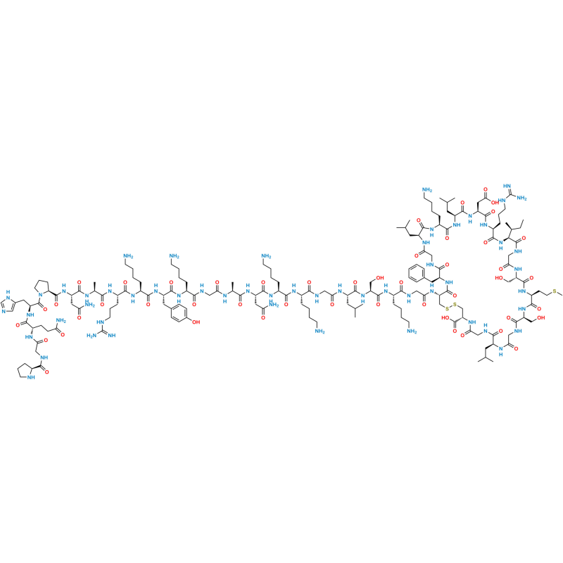 Chemical Name: (4R,10S,16S,19S,22S,28S,31S,34S,37S,40S,43S,49S,52R)-52-(2-((S)-2-((S)-2-((S)-2-(2-((S)-2-((S)-2-((S)-2-((S)-2-(2-((S)-2-((S)-2-((S)-2-((S)-2-((S)-2-((S)-2-((S)-1-(L-prolylglycyl-L-glutaminyl-L-histidyl)pyrrolidine-2-carboxamido)-4-amino-4-oxobutanamido)propanamido)-5-guanidinopentanamido)-6-aminohexanamido)-3-(4-hydroxyphenyl)propanamido)-6-aminohexanamido)acetamido)propanamido)-4-amino-4-oxobutanamido)-6-aminohexanamido)-6-aminohexanamido)acetamido)-4-methylpentanamido)-3-hydroxypropanamido)-6-aminohexanamido)acetamido)-40-(4-aminobutyl)-49-benzyl-28-((S)-sec-butyl)-34-(carboxymethyl)-31-(3-guanidinopropyl)-16,22-bis(hydroxymethyl)-10,37,43-triisobutyl-19-(2-(methylthio)ethyl)-6,9,12,15,18,21,24,27,30,33,36,39,42,45,48,51-hexadecaoxo-1,2-dithia-5,8,11,14,17,20,23,26,29,32,35,38,41,44,47,50-hexadecaazacyclotripentacontane-4-carboxylic acid