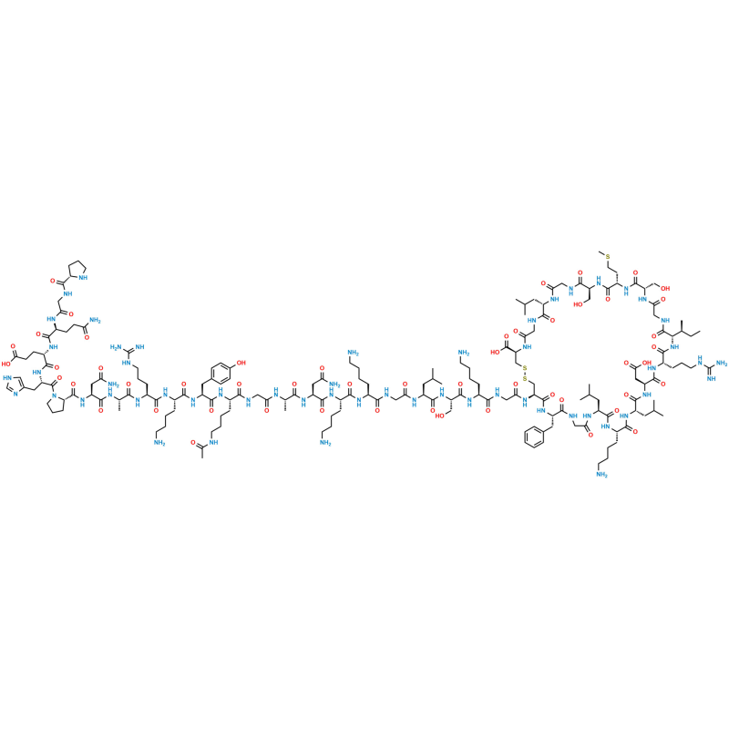 Chemical Name: (4R,10S,16S,19S,22S,28S,31S,34S,37S,40S,43S,49S,52R)-52-(2-((S)-2-((S)-2-((S)-2-(2-((S)-2-((S)-2-((S)-2-((S)-2-(2-((S)-2-((S)-2-((S)-2-((S)-2-((S)-2-((S)-2-((S)-1-(L-prolylglycyl-L-glutaminyl-L-glutamyl-L-histidyl)pyrrolidine-2-carboxamido)-4-amino-4-oxobutanamido)propanamido)-5-guanidinopentanamido)-6-aminohexanamido)-3-(4-hydroxyphenyl)propanamido)-6-acetamidohexanamido)acetamido)propanamido)-4-amino-4-oxobutanamido)-6-aminohexanamido)-6-aminohexanamido)acetamido)-4-methylpentanamido)-3-hydroxypropanamido)-6-aminohexanamido)acetamido)-40-(4-aminobutyl)-49-benzyl-28-((S)-sec-butyl)-34-(carboxymethyl)-31-(3-guanidinopropyl)-16,22-bis(hydroxymethyl)-10,37,43-triisobutyl-19-(2-(methylthio)ethyl)-6,9,12,15,18,21,24,27,30,33,36,39,42,45,48,51-hexadecaoxo-1,2-dithia-5,8,11,14,17,20,23,26,29,32,35,38,41,44,47,50-hexadecaazacyclotripentacontane-4-carboxylic acid