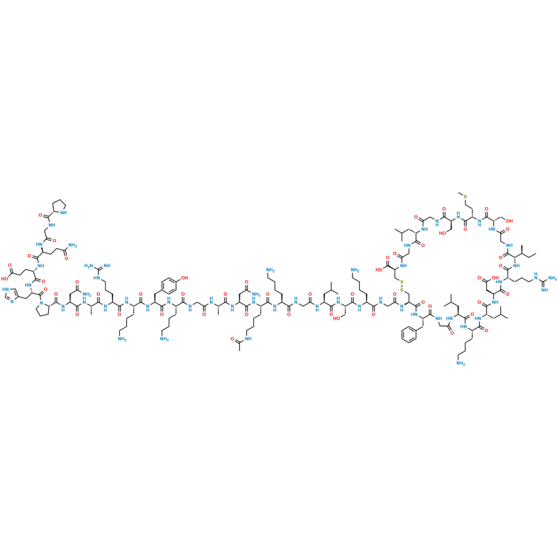 Chemical Name: (4R,10S,16S,19S,22S,28S,31S,34S,37S,40S,43S,49S,52R)-52-(2-((S)-2-((S)-2-((S)-2-(2-((S)-2-((S)-2-((S)-2-((S)-2-(2-((S)-2-((S)-2-((S)-2-((S)-2-((S)-2-((S)-2-((S)-1-(L-prolylglycyl-L-glutaminyl-L-glutamyl-L-histidyl)pyrrolidine-2-carboxamido)-4-amino-4-oxobutanamido)propanamido)-5-guanidinopentanamido)-6-aminohexanamido)-3-(4-hydroxyphenyl)propanamido)-6-aminohexanamido)acetamido)propanamido)-4-amino-4-oxobutanamido)-6-acetamidohexanamido)-6-aminohexanamido)acetamido)-4-methylpentanamido)-3-hydroxypropanamido)-6-aminohexanamido)acetamido)-40-(4-aminobutyl)-49-benzyl-28-((S)-sec-butyl)-34-(carboxymethyl)-31-(3-guanidinopropyl)-16,22-bis(hydroxymethyl)-10,37,43-triisobutyl-19-(2-(methylthio)ethyl)-6,9,12,15,18,21,24,27,30,33,36,39,42,45,48,51-hexadecaoxo-1,2-dithia-5,8,11,14,17,20,23,26,29,32,35,38,41,44,47,50-hexadecaazacyclotripentacontane-4-carboxylic acid