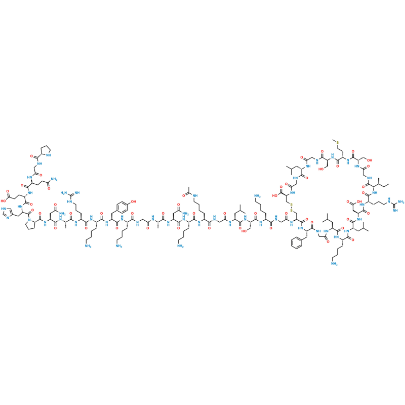 Chemical Name: (4R,10S,16S,19S,22S,28S,31S,34S,37S,40S,43S,49S,52R)-52-(2-((S)-2-((S)-2-((S)-2-(2-((S)-2-((S)-2-((S)-2-((S)-2-(2-((S)-2-((S)-2-((S)-2-((S)-2-((S)-2-((S)-2-((S)-1-(L-prolylglycyl-L-glutaminyl-L-glutamyl-L-histidyl)pyrrolidine-2-carboxamido)-4-amino-4-oxobutanamido)propanamido)-5-guanidinopentanamido)-6-aminohexanamido)-3-(4-hydroxyphenyl)propanamido)-6-aminohexanamido)acetamido)propanamido)-4-amino-4-oxobutanamido)-6-aminohexanamido)-6-acetamidohexanamido)acetamido)-4-methylpentanamido)-3-hydroxypropanamido)-6-aminohexanamido)acetamido)-40-(4-aminobutyl)-49-benzyl-28-((S)-sec-butyl)-34-(carboxymethyl)-31-(3-guanidinopropyl)-16,22-bis(hydroxymethyl)-10,37,43-triisobutyl-19-(2-(methylthio)ethyl)-6,9,12,15,18,21,24,27,30,33,36,39,42,45,48,51-hexadecaoxo-1,2-dithia-5,8,11,14,17,20,23,26,29,32,35,38,41,44,47,50-hexadecaazacyclotripentacontane-4-carboxylic acid
