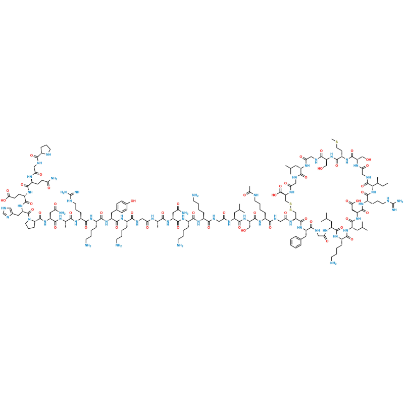 Chemical Name: (4R,10S,16S,19S,22S,28S,31S,34S,37S,40S,43S,49S,52R)-52-(2-((S)-2-((S)-2-((S)-2-(2-((S)-2-((S)-2-((S)-2-((S)-2-(2-((S)-2-((S)-2-((S)-2-((S)-2-((S)-2-((S)-2-((S)-1-(L-prolylglycyl-L-glutaminyl-L-glutamyl-L-histidyl)pyrrolidine-2-carboxamido)-4-amino-4-oxobutanamido)propanamido)-5-guanidinopentanamido)-6-aminohexanamido)-3-(4-hydroxyphenyl)propanamido)-6-aminohexanamido)acetamido)propanamido)-4-amino-4-oxobutanamido)-6-aminohexanamido)-6-aminohexanamido)acetamido)-4-methylpentanamido)-3-hydroxypropanamido)-6-acetamidohexanamido)acetamido)-40-(4-aminobutyl)-49-benzyl-28-((S)-sec-butyl)-34-(carboxymethyl)-31-(3-guanidinopropyl)-16,22-bis(hydroxymethyl)-10,37,43-triisobutyl-19-(2-(methylthio)ethyl)-6,9,12,15,18,21,24,27,30,33,36,39,42,45,48,51-hexadecaoxo-1,2-dithia-5,8,11,14,17,20,23,26,29,32,35,38,41,44,47,50-hexadecaazacyclotripentacontane-4-carboxylic acid
